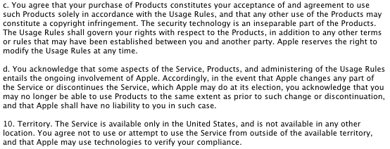 Apple yesterday launched their music service. Encrypted AAC 128 kbps. DRM enforced by iTunes 4. Apple reserves the right to modify the Usage Rules at any time. US only. Compared to other music services which use DRM, it’s the least fair use-hostile.